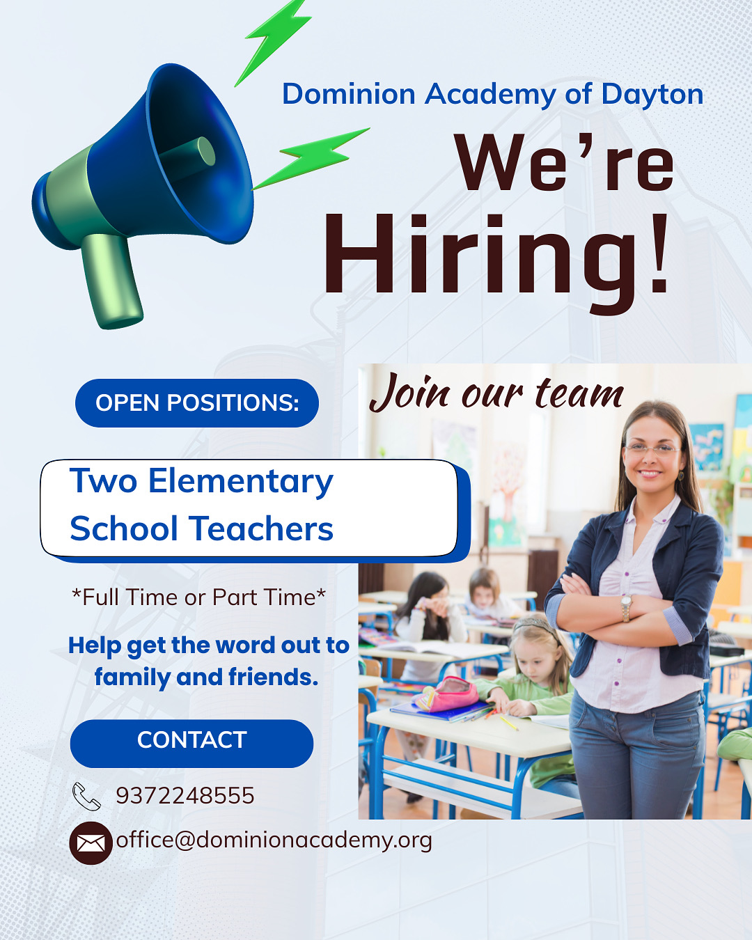 Dominion Academy is seeking the following positions for the 2025-2026 school year: